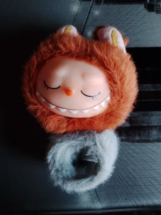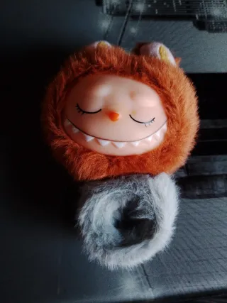 Peluche suave y divertido con diseño de Bubu. - Material exterior de pelo naranja. - Cara de muñeco con ojos cerrados y sonrisa. - Parte inferior de pelo gris, con abrazadera para mano - dispositivo en la cabeza que canta la canción de la Bubu