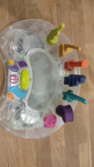Divertido juguete musical interactivo con varios instrumentos. - Diseño transparente y colorido. - Incluye figuras de instrumentos como violín, trompeta, piano, batería y platillos. - Botones de colores para diferentes sonidos y ritmos.
