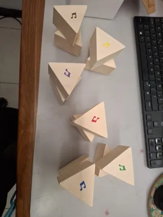 Conjunto de juguetes de madera con diseños de notas musicales. - Cada pieza tiene una nota musical de un color diferente. - Hechos de madera clara.