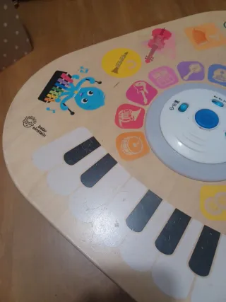 Mesa de actividades musicales de la marca Baby Einstein. Ideal para que los más pequeños exploren sonidos y ritmos. - Diseño triangular con patas. - Superficie decorada con motivos musicales e infantiles. - Incluye teclado de piano. - Centro interactivo con botones y luces. - Tres idiomas distintos (español, inglés i francés)
