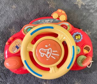 Volante de juguete interactivo con luces y sonidos. - Incluye teclas con notas musicales y sonidos de vehículos. - Botones de colores con diferentes funciones. - Diseño atractivo y seguro para niños. Hace de todo: sonido de encender el coche, bocina, sonido de intermitente, música, sonido de cada uno de los transportes que hay en las teclas, sonido de risa de bebé. Muy completo y divertido.