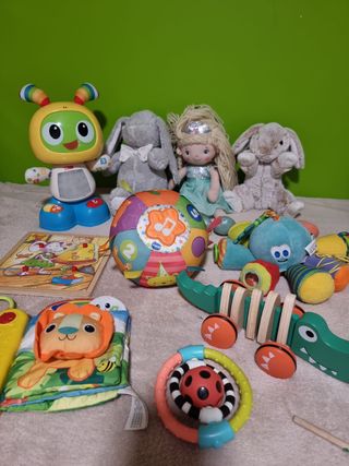 Pack de 10 juguetes variados para bebés, incluyendo marcas como Fisher-Price y VTech. Ideal para estimular el desarrollo. - Robot musical. - Peluches de conejos - Muñeca. - Pelota interactiva. - Cocodrilo de madera. - pulpo para carrito - Sonajero. - Libro de tela. - Puzzle de madera.