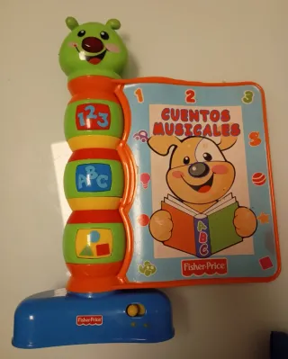 Libro interactivo musical de Fisher-Price con temática de cuentos. - Diseño de oruga con segmentos apilables. - Botones con números, letras y figuras. - Ilustración de perro leyendo un libro. - Incluye el logo de Fisher-Price. -Tiene en la primera página el papel un poco estropeado