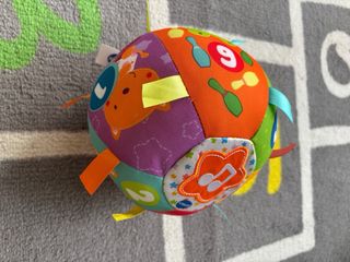 Bola interactiva VTech para bebés, llena de colores y texturas. - Diseños de animales y números. - Tiras de tela para estimular el tacto. - Centro con diseño de flor y notas musicales.