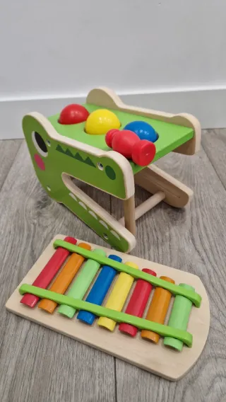 Divertido cocodrilo musical con xilófono. - Incluye martillo para golpear las bolas. - Xilófono de colores extraíble. - Diseño de cocodrilo con cara sonriente. - Al caer las bolas suena el xilófono.