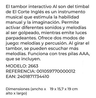 Tambor interactivo con luces y sonidos para los más pequeños. Fomenta la creatividad y el aprendizaje musical. - Diseño colorido y atractivo. - Botones con diferentes ritmos y melodías. - Incluye figuras de estrellas y notas musicales.