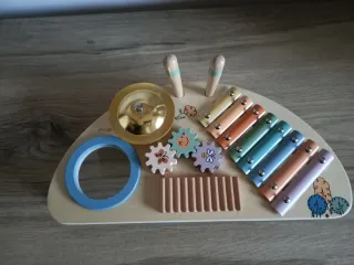 Mesa musical de madera para bebés de la marca Imaginarium. Ideal para estimular la creatividad y el oído de los más pequeños. - Incluye xilófono de colores. - Tambor y platillo. - Engranajes giratorios. - Espejo. - Baquetas de madera.