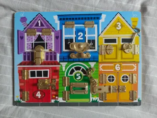 Divertido tablero de madera con diferentes cierres y puertas para que los niños aprendan a abrirlos y cerrarlos. - Diseñado por Melissa & Doug. - Incluye 6 puertas con diferentes tipos de cierres. - Cada puerta está decorada con un número y un diseño colorido.