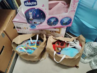 Lote variado de juguetes para niños y niñas, incluye peluches y juegos. INCLUYE TODOS LOS JUEGUETES QUE APARECEN EN LAS FOTOS. Todo funciona perfectamente. -piedras de equilibrio. -balancin. - Peluche azul. - Juguete de construcción. - Juego de mesa Barn Bolas. - Proyector Next2Moon de Chicco. - Caja de juguete con formas. - Otros juguetes y accesorios. Cualquier duda preguntame.