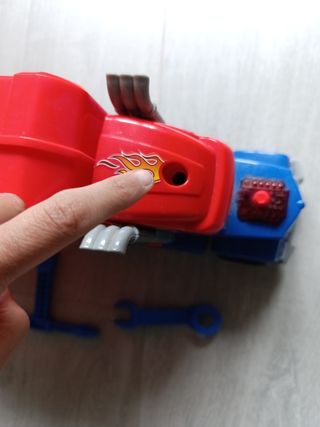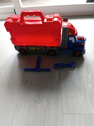Camión de juguete tipo grúa de rescate, de color naranja y azul. - Incluye un coche azul pequeño. - Diseño de camión de rescate 24 horas. - Ruedas de goma. - mecanismo hidraulico , no necesita pilas # niño niña juego juguete construccion remolque grua asistencia taller