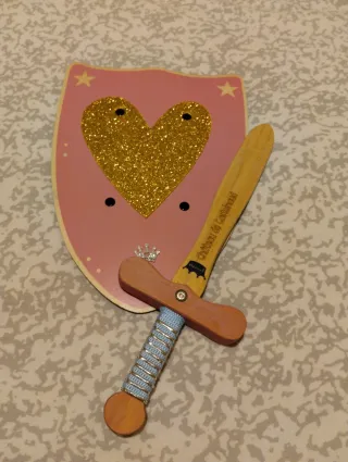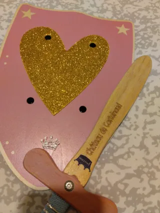 Set de juego de madera para niños, ideal para imaginar aventuras. Comprados en un castillo de Francia. - Escudo rosa con detalles de estrellas y corazón. - Espada de madera con empuñadura decorada.