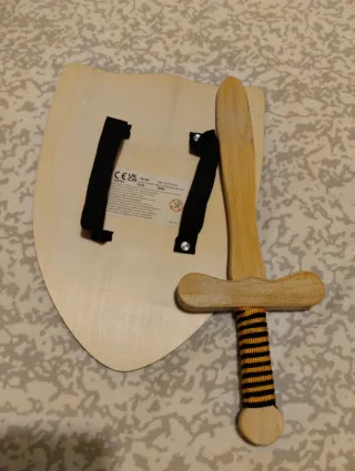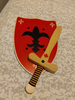 Set de juego de madera para niños, ideal para recrear aventuras. Comprados en un castillo de Francia. - Escudo rojo con diseño de flor de lis. - Espada de madera con empuñadura decorada.