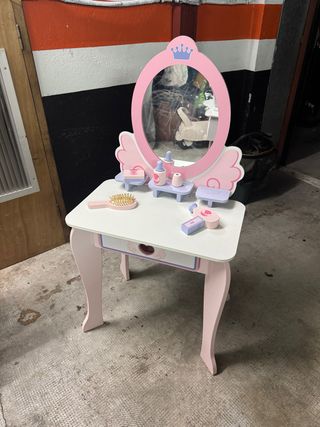 Precioso tocador de madera para niñas, con un diseño encantador y accesorios. - Espejo ovalado con marco rosa y detalles de corona y alas. - Incluye peine, botellas y otros accesorios de juguete. - Cajón con detalle de corazón. - Patas rosas decorativas. - Silla a juego