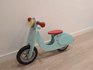 Divertida moto Vespa de juguete para niños, fabricada en madera. - Diseño inspirado en la icónica Vespa. - Color azul pastel. - Asiento rojo. - Ruedas negras.