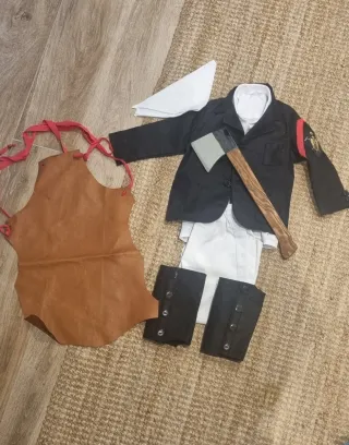 Conjunto de vestuario para niño con temática de leñador. - Chaqueta negra con detalles en manga. - Pantalón blanco. - Delantal de cuero marrón. - Pañuelo blanco. - Puños negros. - Hacha de juguete.