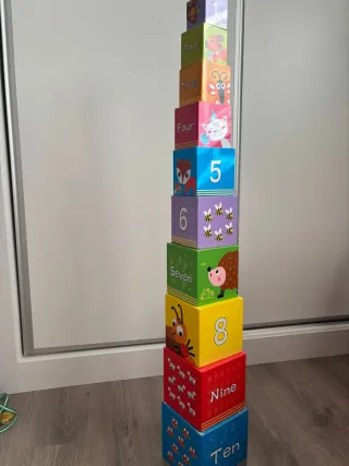 Set de cubos apilables de cartón para niños, con números y dibujos. - Diseños de animales y números del 1 al 10. - Fomenta el aprendizaje y la motricidad. - Material resistente y seguro para los más pequeños.