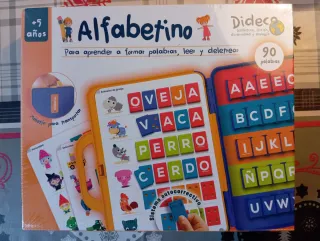 Alfabetino de la marca dideco para ayudar a los más pequeños a aprender a leer y formar palabras. Muy didáctico y transportable. Tiene unas láminas de cartón temáticas con palabras, cuyos huecos de las letras están agujereados, y fichas de letras que encajan en esos huecos.