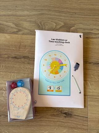 Set de aprendizaje para enseñar a los niños a leer la hora. Incluye un reloj de madera y dados. - Tampon reloj de madera con dado - pizarra con rotulador borrable Ideal para aprender las horas