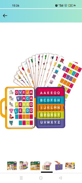 Bonito juego educativo para niños a partir de 5 años. Ayuda a formar palabras, leer y deletrear. - Incluye 15 láminas y 90 fichas. - Sistema autocorrectivo, sólo la ficha correcta encaja en la lámina. Maletín muy práctico para guardar todo el material y transportarlo.