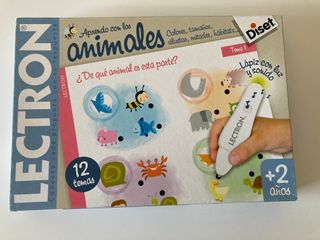 Juego educativo LECTRON de Diset para aprender sobre animales. Ideal para niños a partir de 2 años. - Incluye lápiz con luz y sonido. - Explora temas como colores, tamaños, siluetas, mitades y hábitats. - Contiene 12 temas diferentes.
