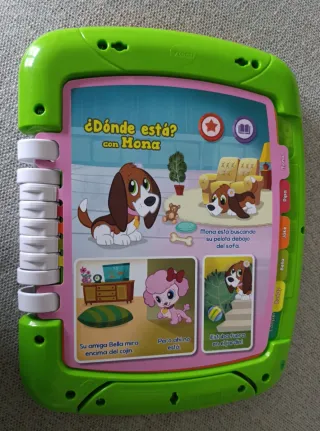 Libro-Tablet Multiaventura de VTech, un juguete educativo diseñado para niños de 2 a 5 años. Cuenta con dos caras interactivas con funciones diferentes; se puede usar como un libro tradicional o como una tablet simplemente cambiando la orientación. El modo libro incluye páginas ilustradas donde los niños descubren actividades para aprender palabras, posiciones, colores y formas.