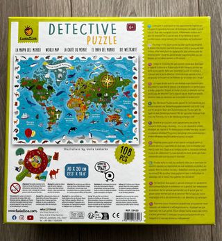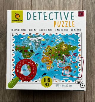Puzzle educativo de Ludattica con un mapa del mundo lleno de animales. - 108 piezas. - Tamaño: 70x50 cm. - Incluye lupa para buscar animales. - Ideal para aprender geografía y fauna. - Fabricado en Italia.