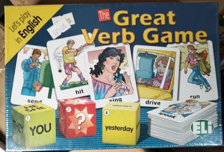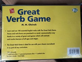 Aprende y usa 100 verbos esenciales en inglés. Con este juego las formas verbales y los tiempos son practicados de una forma novedosa y comunicativa gracias a una variedad de fantásticos juegos de cartas que motivarán y involucrarán a los alumnos de todas las edades y etapas. Ideal para usar con el libro de texto elegido o como parte de cualquier plan de estudios. Contiene 100 cartas de verbos, 1 dado de formas verbales, 1 dado de pronombres personales, 1 dado de signos, guía del maestro y tabla de verbos.