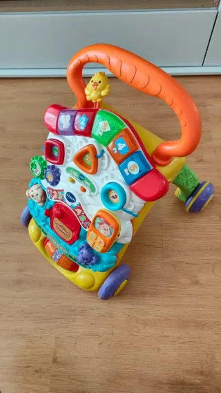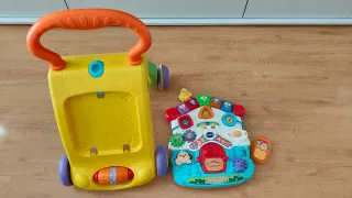 Andador y centro de actividades VTech-Baby. - Panel extraíble con voz y música. Piano con 5 botones de colores con luz para aprender los números y las notas musicales. 3 encajables para que descubra el nombre de las formas y los animales y un pajarito que activa diferentes melodías y sonidos. Teléfono de juguete que imita al de los mayores, activando distintas frases y sonidos al colgarlo y descolgarlo. - Patas plegables con ruedas con freno regulador de velocidad.