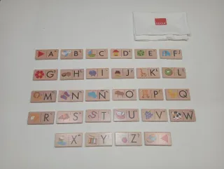 Dominó abecedario de madera de la marca GOULA. Viene con su bolsita de tela para guardar y transportar las fichas. ~Puedes ver más juguetes en mi perfil perfectos para aprender las letras~