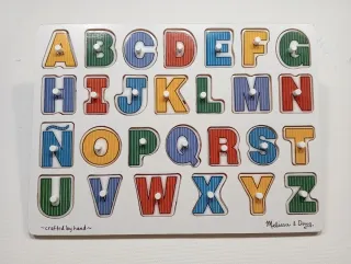 Puzzle de madera del abecedario español (incluye la Ñ) de la marca MELISSA & DOUG. Perfecto para que los peques aprendan el alfabeto ya que cada letra se asocia con una imagen. ~Puedes ver más juguetes en mi perfil perfectos para aprender las letras~