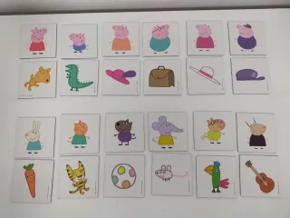 Lote de 4 juegos de mesa con personajes de Peppa Pig para divertirse y aprender: - Memory de 12 parejas con los personajes y amigos de Peppa Pig con sus objetos favoritos. - Puzzle para unir números y cantidad. Del 1 al 12. - 2 puzzles temáticos de Peppa Pig de 25 piezas cada uno