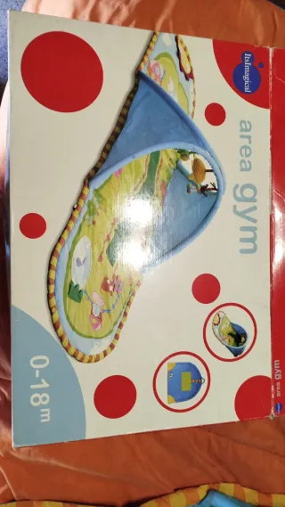 Gimnasio de actividades para bebés de la marca ItsImagical, apto para edades de 0 a 18 meses. Presenta un diseño colorido con temática de granja y animales. - Incluye varios juguetes colgantes. - Tapete acolchado con dibujos. - Arco superior para colgar los juguetes.
