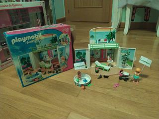 Casa o bungalow de la playa de Playmobil. Contiene casa, 3 Playmobil (mamá, niña y bebé), 2 gatitos, un carrito de paseo, tumbona, mesa y todos los accesorios que se ven en las fotos. La casita se cierra con llave y se convierte en un cofre para guardar todo en su interior. Está nuevo y conserva su caja original.