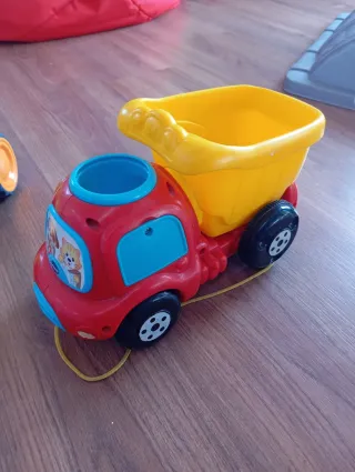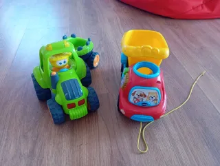 Juguetes de arrastre para bebés y niños pequeños en buen estado. - Miguelón el Camión de Vtech baby. Color rojo con detalles de animales y un remolque interactivo amarillo. Incluye dos pelotas - Tractor verde con figura de conductor y remolque. Con sonido y luces Precio por unidad= 7 euros. Los dos juntos por 10. Con signos de uso, pero totalmente funcionales.