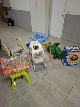 Lote de juguetes variados para niños de 1 a 3 años. - Mini futbolín. - Columpio de colgar - Mini parque bolas - Escritorio Bluey - Mochila andar bebe Jane - Mini silla plástico - Tractor de pedales. - Escalera wc - Escalera aprendizaje - Tienda indio