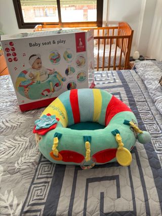 Asiento de actividades para bebé con diseño de jirafa Sophie. - Tejido suave y acolchado. - Incluye varios juguetes colgantes. - Base estable para el apoyo del bebé. ** Asiento de juegos de la jirafa sophie. A partir de 3 meses en adelante. Apenas se ha usado. Trae todo los accesorios que corresponden al asiento para estimular los cinco sentidos. Se puede lavar sin problemas en la lavadora. Buen acolchado. Base antideslizante.** SOLO ENVÍOS