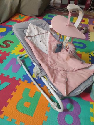 hamaca con saco rosa de regalo. la hamaca se convierte en silla para bebes desde recién nacidos hasta niños de hasta 18 kg. la hamaca tiene 3 posiciones más vertical, media y más tumbada. viene con música y vibración. está música y vibración se pueden quitar cuando el niño crezca regalo juguete colgante regalo mosquitera. con instrucciones y caja original. precio original 69.99
