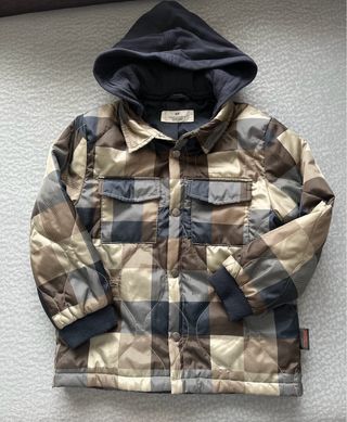 Chaqueta acolchada, tipo sobrecamisa guateada para niño, talla 4-6 años, marca H&M. Diseño a cuadros en tonos azul marino, verdes y marrones. Capucha que se puede quitar y poner con velcro. Forro interior de Thermolite® EcoMade. Perfecto estado, como nueva, impecable. Más ropa, zapatos, juguetes y demás artículos de bebé, niña/niño y embarazada en mi perfil