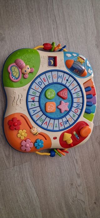 Mesa de actividades interactiva para bebés con múltiples juegos, español e ingles (incluye las 4 patas en perfecto estado -ahora esta desmontada-) - Incluye un xilófono con teclas de colores. - Incorpora un teléfono con botones. - Tiene un tobogán con figuras. - Incluye un panel con letras del abecedario. - Cuenta con un tambor giratorio con animales.