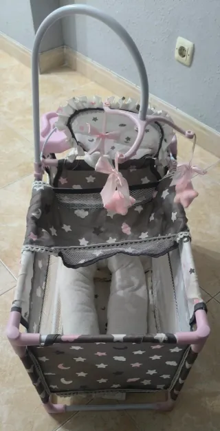 Cuna de juguete para muñeca bebé, con un diseño encantador y detalles de estrellas y nubes, se vende montada, comprada en Amazon, costó 55€. Medidas: 60x32x43 - Incluye almohada de nube - Incluye sabana y chichonera - Incluye móvil con adornos. - Incluye Bandeja lateral y trona. - Estructura de tubos y tela. - Colores: rosa, gris y blanco. CON LA COMPRA DE LA CUNA REGALO PUZZLE PARA NIÑ@S DE +5 AÑOS, DE 100 PIEZAS DE GABBY GATO.