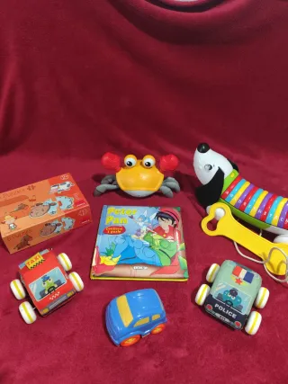 Lote de juguetes para bebés de 2 años. - Un cangrejo amarillo con música y sonidos. Se desplaza a los lados para que el bebé lo capture. Cuenta con unos sensores en las pinzas para detectar objetos y cambiar de dirección. (Lo mando sin cable de carga ya que se rompió. Se puede comprar en cualquier chino, no vale mucho. Sería un cable DC 5V.) - Dos coches super rápidos y blanditos. Corren un montón y la carcasa se puede extraer para lavar. - Puzzle de madera de dos piezas, completo y en prfecto estado. - Cuento con puzzle. - Perrito de arrastre con sonidos y botones. (Esta marcado pero anda perfecto) ❗SOLO REALIZO ENVIOS.