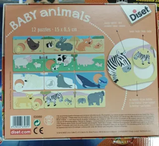 Juego educativo Baby Animals de Diset para los más pequeños. Ayuda a relacionar las crías con sus mamás. Falta una cría. La de la leona. Ver la ultima foto. - Incluye 5 pares de animales (mamá y bebé). - Diseñado para niños a partir de 24 meses. - Dimensiones: 15 x 8,5 cm.