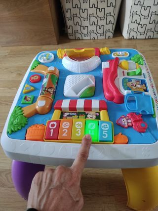 mesa interactiva de actividades muy completa para bebés a partir de 6 meses, de Fisher Price,para desarrollar la coordinación y estimulación,así como la audición.Costa de 3niveles de dificultad de juegos (también en inglés) y 2 niveles de volumen.PAtas desmontables sin tornillos NOS COSTO MAS DEL DOBLE