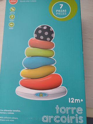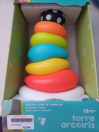 Torre apilable arcoiris para bebés de 12 meses o más. Es colorida y divertida. En si caja original y prácticamente nueva. - 7 piezas de diferentes tamaños y colores. - Hace sonidos cuando se mueve. - Ideal para el desarrollo de la motricidad fina.