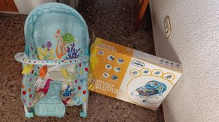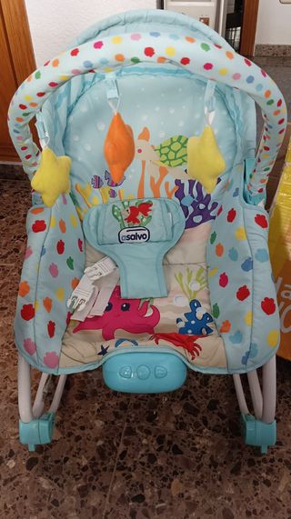 Hamaca evolutiva Asalvo, incluye caja e instrucciones,diseño marino.Desmontada en su caja. Uso desde el nacimiento hasta los 18 kg. Posición Silla hasta 18 kg. Posición Hamaca hasta 9 kg. Respaldo reclinable. Varios niveles de vibración relajante que ayudan a tranquilizar a los bebés más pequeños. Barra de juguetes extraíble para que el niño pueda jugar a sentarse y levantarse. Juguetes en el arco para estimular la motricidad del bebé. Textil muy acolchado, desenfundable y lavable. Arnés de 3 puntos. 9 Melodías para distraer y relajar al bebé Luz de cromoterapia. Peso: 2,7 Kg. Edad De Uso: Hamaca 0 A 9 Meses – Silla 9 A 36 Meses.