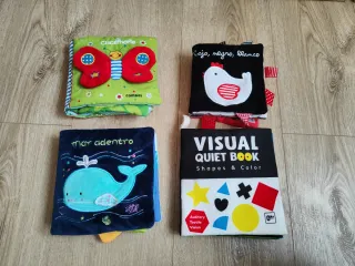 Lote de 4 libros blanditos, aptos desde 0 meses. -Libro formas y color (visual quiet book). Precio en tienda 12 € -> lo dejo en 7€ Ideal para mostrarlo desde recién nacido porque tiene colores en blanco y negro y las hojas haces ruidos llamativos - Libro Rojo, negro, blanco. PvP 15€ -> Lo dejo en 9€ Ideal para mostrarlo desde recién nacido porque tiene colores en blanco y negro y las hojas haces ruidos llamativos y tiene cascabeles - Cucamona. PvP 19,50€ -> Lo dejo en 13€ -Mar adentro. Pvp 18,50 -> Lo dejo en 13€ Si cogéis el lote completo os lo dejo en 35€. Ya está rebajado, abstenerse intentar bajar más el precio.