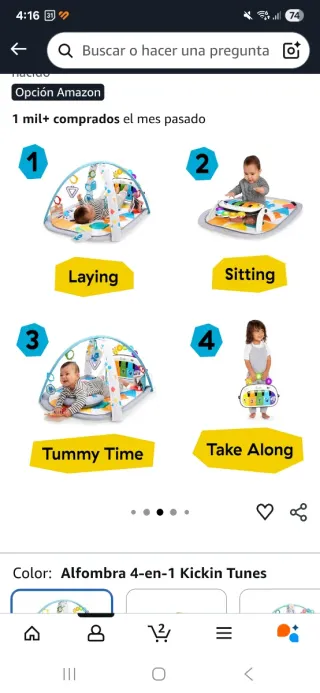 Gimnasio de actividades musical para bebés de Baby Einstein. - Diseñado para edades de 0 a 36 meses. - Medidas aproximadas: 8.7 in (22.1 cm) de alto, 11.9 in (30.23 cm) de ancho y 5.22 in (13.26 cm) de profundidad. - Modelo: Alfombra 4-en-1 Kickin Tunes.