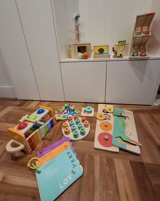 Conjunto de juguetes educativos Lovevery, ideal para el desarrollo de bebés de 7 a 18 meses. - Incluye xilófono con martillo. - Juego de apilar aros. - Rompecabezas de formas. - Bloques de construcción. - Pelotas de madera.