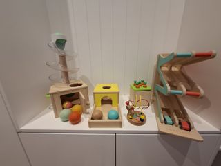 Pack de juguetes para bebés de la marca Oh My Baby. Precio original: 54€ Incluye varios elementos para el desarrollo y entretenimiento adaptadas a la edad (7-8 meses): - Caja de permanencia - Libro de madera animales - Círculo encajable - Pelota gateo En perfecto estado a pesar del uso (están tal cual se ven en la foto, mi monstruito ya tiene más de 2 años y medio y no ha roto ni un solo juguete), super buena calidad.
