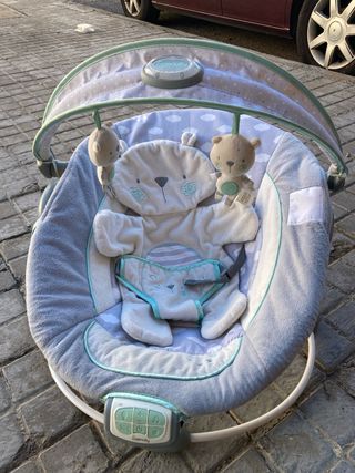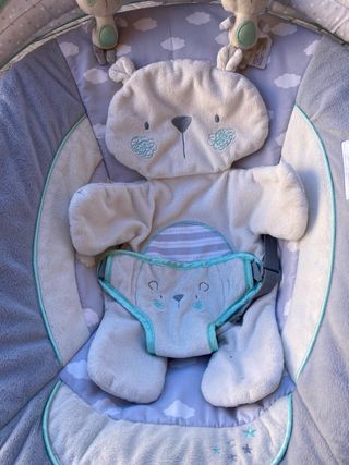 Hamaca suave y cómoda para bebés, con un diseño de osito. - Capota movil con juguetes colgantes, diferentes posturas - Cojín reductor. - Arnés de seguridad. Tiene musica incorporada, no funciona la luz de la capota. Ideal para bebés desde recién nacidos hasta unos 7-8 meses